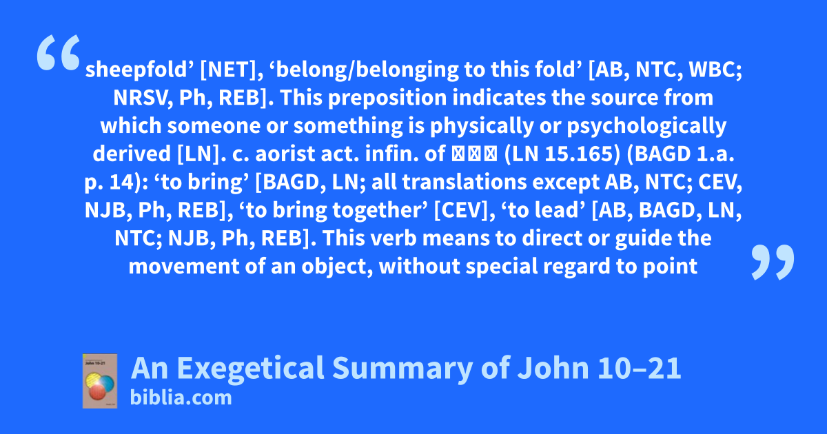 sheepfold’ [NET], ‘belong/belonging to this fold’ [AB, NTC, WBC; NRSV, Ph, REB]. This preposition indicates the source from which someone or something is physically or psychologically derived [LN]. c. aorist act. infin. of ἄγω (LN 15.165) (BAGD 1.a. p. 14): ‘to bring’ [BAGD, LN; all translations except AB, NTC; CEV, NJB, Ph, REB], ‘to bring together’ [CEV], ‘to lead’ [AB, BAGD, LN, NTC; NJB, Ph, REB]. This verb means to direct or guide the movement of an object, without special regard to point
