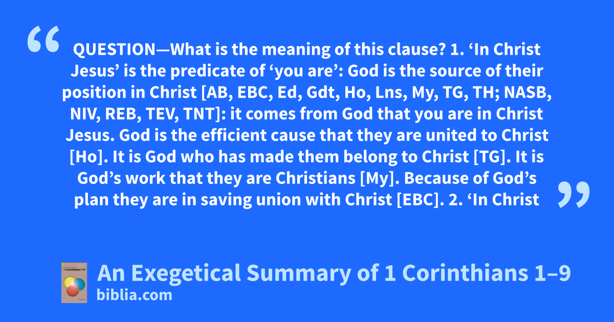 QUESTION—What is the meaning of this clause? 1. ‘In Christ Jesus’ is the predicate of ‘you are’: God is the source of their position in Christ [AB, EBC, Ed, Gdt, Ho, Lns, My, TG, TH; NASB, NIV, REB, TEV, TNT]: it comes from God that you are in Christ Jesus. God is the efficient cause that they are united to Christ [Ho]. It is God who has made them belong to Christ [TG]. It is God’s work that they are Christians [My]. Because of God’s plan they are in saving union with Christ [EBC]. 2. ‘In Christ