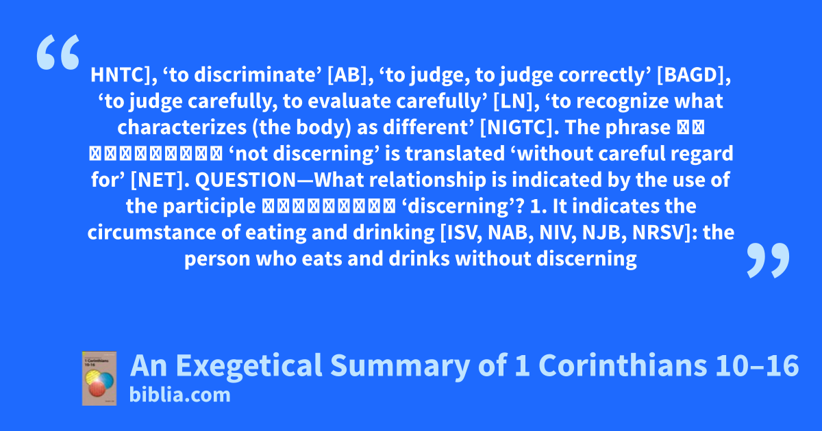 HNTC], ‘to discriminate’ [AB], ‘to judge, to judge correctly’ [BAGD], ‘to judge carefully, to evaluate carefully’ [LN], ‘to recognize what characterizes (the body) as different’ [NIGTC]. The phrase μὴ διακρίνων ‘not discerning’ is translated ‘without careful regard for’ [NET]. QUESTION—What relationship is indicated by the use of the participle διακρίνων ‘discerning’? 1. It indicates the circumstance of eating and drinking [ISV, NAB, NIV, NJB, NRSV]: the person who eats and drinks without discerning