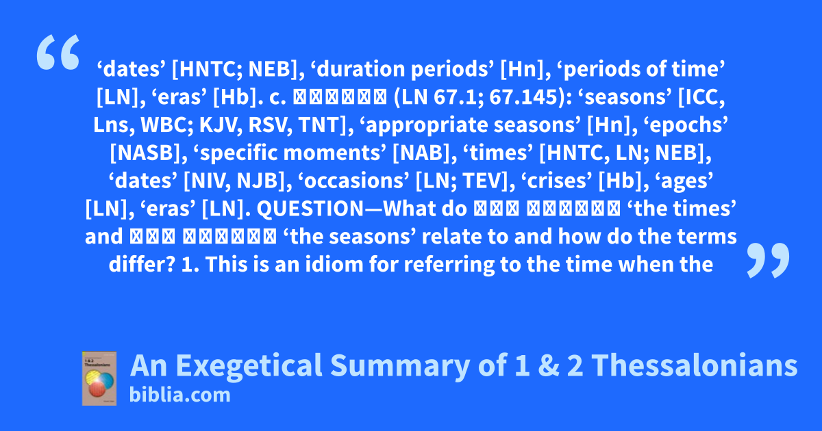 ‘dates’ [HNTC; NEB], ‘duration periods’ [Hn], ‘periods of time’ [LN], ‘eras’ [Hb]. c. καιρός (LN 67.1; 67.145): ‘seasons’ [ICC, Lns, WBC; KJV, RSV, TNT], ‘appropriate seasons’ [Hn], ‘epochs’ [NASB], ‘specific moments’ [NAB], ‘times’ [HNTC, LN; NEB], ‘dates’ [NIV, NJB], ‘occasions’ [LN; TEV], ‘crises’ [Hb], ‘ages’ [LN], ‘eras’ [LN]. QUESTION—What do τῶν χρόνων ‘the times’ and τῶν καιρῶν ‘the seasons’ relate to and how do the terms differ? 1. This is an idiom for referring to the time when the