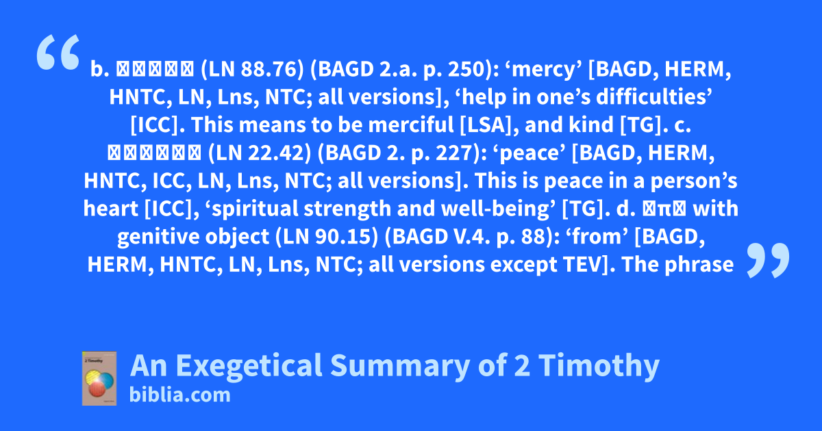 b. ἔλεος (LN 88.76) (BAGD 2.a. p. 250): ‘mercy’ [BAGD, HERM, HNTC, LN, Lns, NTC; all versions], ‘help in one’s difficulties’ [ICC]. This means to be merciful [LSA], and kind [TG]. c. εἰρήνη (LN 22.42) (BAGD 2. p. 227): ‘peace’ [BAGD, HERM, HNTC, ICC, LN, Lns, NTC; all versions]. This is peace in a person’s heart [ICC], ‘spiritual strength and well-being’ [TG]. d. ἀπό with genitive object (LN 90.15) (BAGD V.4. p. 88): ‘from’ [BAGD, HERM, HNTC, LN, Lns, NTC; all versions except TEV]. The phrase