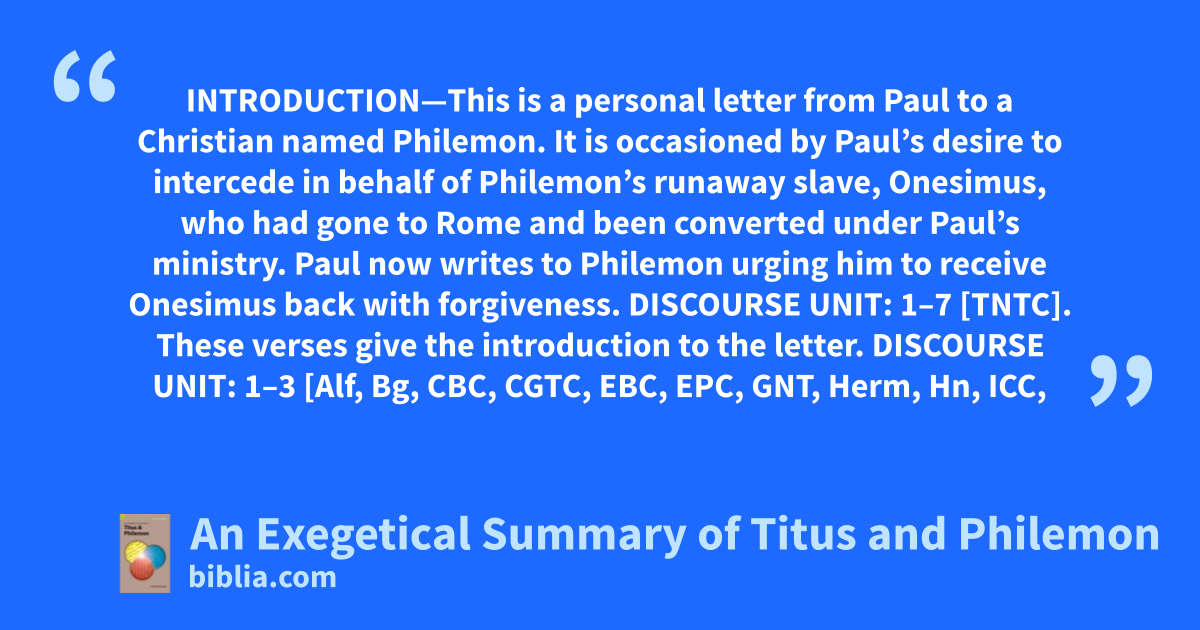 INTRODUCTION—This is a personal letter from Paul to a Christian named Philemon. It is occasioned by Paul’s desire to intercede in behalf of Philemon’s runaway slave, Onesimus, who had gone to Rome and been converted under Paul’s ministry. Paul now writes to Philemon urging him to receive Onesimus back with forgiveness. DISCOURSE UNIT: 1–7 [TNTC]. These verses give the introduction to the letter. DISCOURSE UNIT: 1–3 [Alf, Bg, CBC, CGTC, EBC, EPC, GNT, Herm, Hn, ICC,
