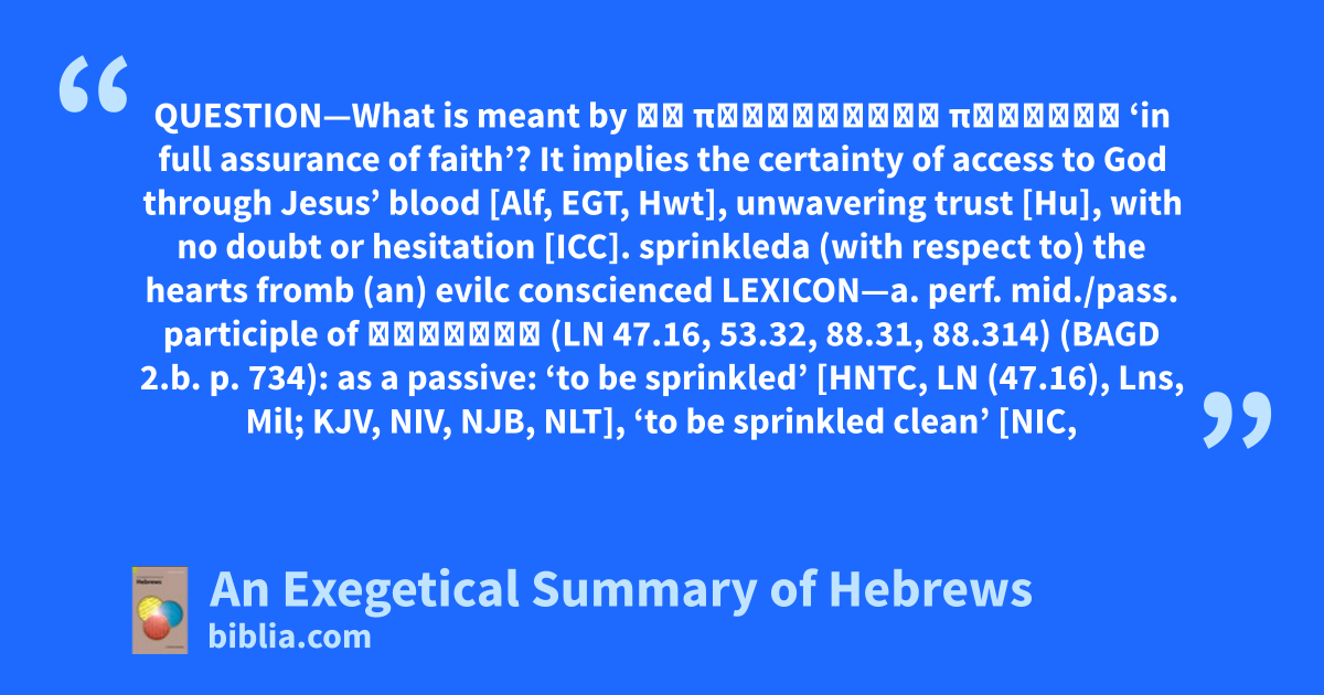 QUESTION—What is meant by ἐν πληροφορίᾳ πίστεως ‘in full assurance of faith’? It implies the certainty of access to God through Jesus’ blood [Alf, EGT, Hwt], unwavering trust [Hu], with no doubt or hesitation [ICC]. sprinkleda (with respect to) the hearts fromb (an) evilc conscienced LEXICON—a. perf. mid./pass. participle of ῥαντίζω (LN 47.16, 53.32, 88.31, 88.314) (BAGD 2.b. p. 734): as a passive: ‘to be sprinkled’ [HNTC, LN (47.16), Lns, Mil; KJV, NIV, NJB, NLT], ‘to be sprinkled clean’ [NIC,