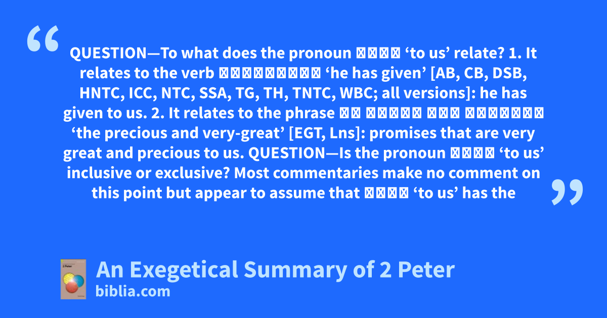 QUESTION—To what does the pronoun ἡμῖν ‘to us’ relate? 1. It relates to the verb δεδώρηται ‘he has given’ [AB, CB, DSB, HNTC, ICC, NTC, SSA, TG, TH, TNTC, WBC; all versions]: he has given to us. 2. It relates to the phrase τὰ τίμια καὶ μέγιστα ‘the precious and very-great’ [EGT, Lns]: promises that are very great and precious to us. QUESTION—Is the pronoun ἡμῖν ‘to us’ inclusive or exclusive? Most commentaries make no comment on this point but appear to assume that ἡμῖν ‘to us’ has the