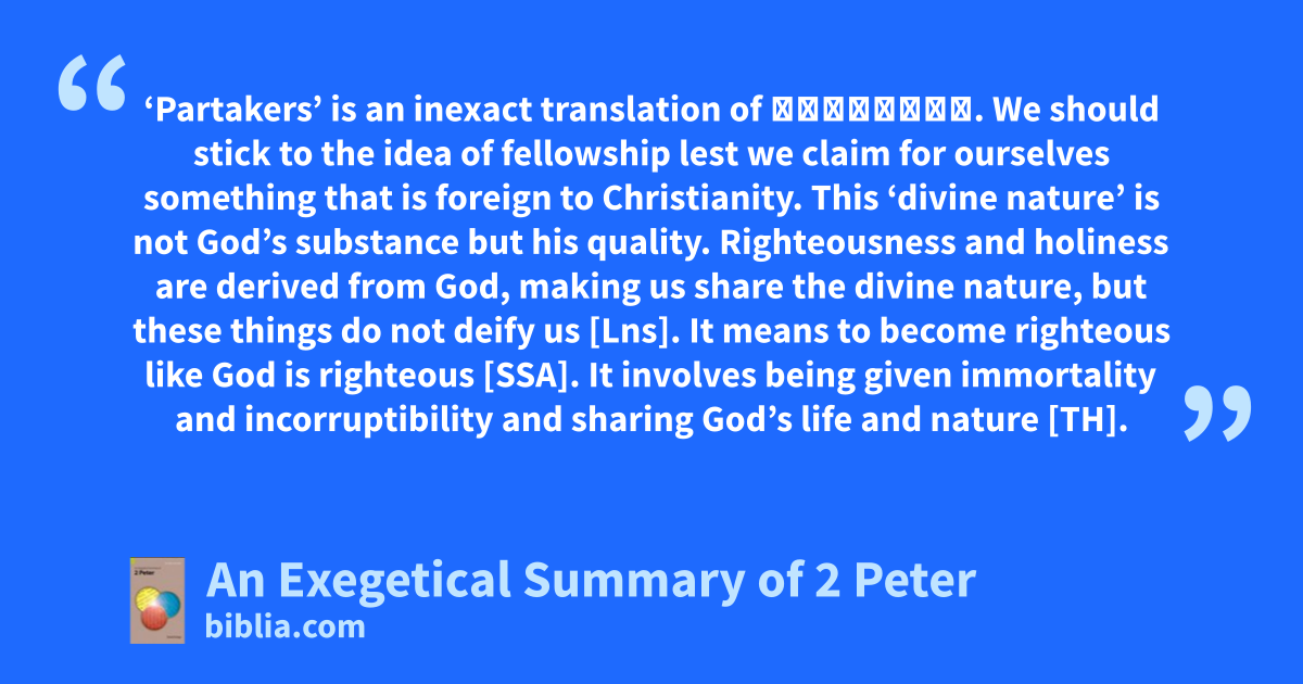 ‘Partakers’ is an inexact translation of κοινωνοί. We should stick to the idea of fellowship lest we claim for ourselves something that is foreign to Christianity. This ‘divine nature’ is not God’s substance but his quality. Righteousness and holiness are derived from God, making us share the divine nature, but these things do not deify us [Lns]. It means to become righteous like God is righteous [SSA]. It involves being given immortality and incorruptibility and sharing God’s life and nature [TH].