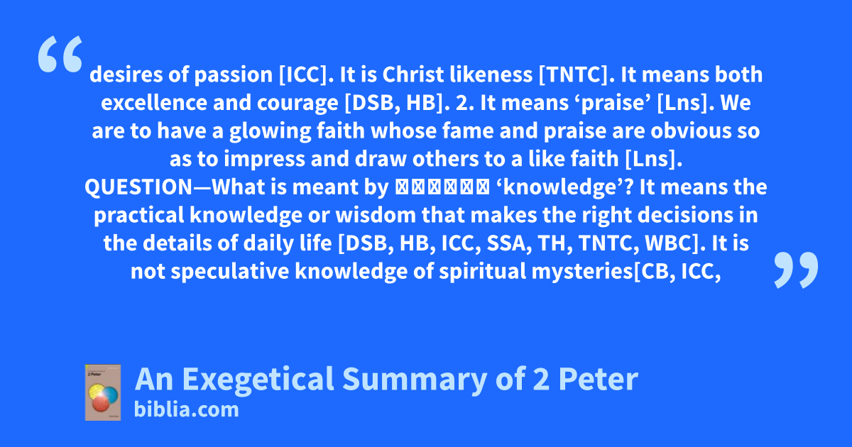 desires of passion [ICC]. It is Christ likeness [TNTC]. It means both excellence and courage [DSB, HB]. 2. It means ‘praise’ [Lns]. We are to have a glowing faith whose fame and praise are obvious so as to impress and draw others to a like faith [Lns]. QUESTION—What is meant by γνῶσιν ‘knowledge’? It means the practical knowledge or wisdom that makes the right decisions in the details of daily life [DSB, HB, ICC, SSA, TH, TNTC, WBC]. It is not speculative knowledge of spiritual mysteries[CB, ICC,