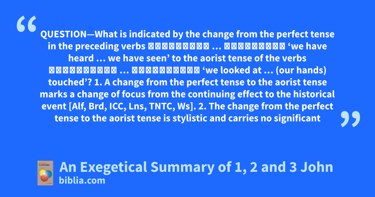 QUESTION—What is indicated by the change from the perfect tense in the preceding verbs ἀκηκόαμεν … ἑωράκομεν ‘we have heard … we have seen’ to the aorist tense of the verbs ἐθεασάμεθα … ἐψηλάφησαν ‘we looked at … (our hands) touched’? 1. A change from the perfect tense to the aorist tense marks a change of focus from the continuing effect to the historical event [Alf, Brd, ICC, Lns, TNTC, Ws]. 2. The change from the perfect tense to the aorist tense is stylistic and carries no significant