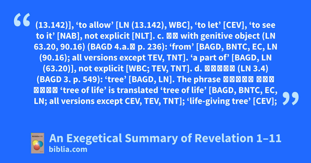 (13.142)], ‘to allow’ [LN (13.142), WBC], ‘to let’ [CEV], ‘to see to it’ [NAB], not explicit [NLT]. c. ἐκ with genitive object (LN 63.20, 90.16) (BAGD 4.a.ε p. 236): ‘from’ [BAGD, BNTC, EC, LN (90.16); all versions except TEV, TNT]. ‘a part of’ [BAGD, LN (63.20)], not explicit [WBC; TEV, TNT]. d. ξύλον (LN 3.4) (BAGD 3. p. 549): ‘tree’ [BAGD, LN]. The phrase ξύλον τῆς ζωῆς ‘tree of life’ is translated ‘tree of life’ [BAGD, BNTC, EC, LN; all versions except CEV, TEV, TNT]; ‘life-giving tree’ [CEV];
