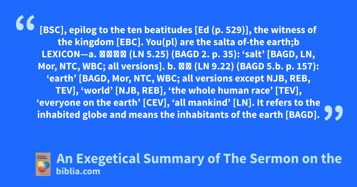 [BSC], epilog to the ten beatitudes [Ed (p. 529)], the witness of the kingdom [EBC]. You(pl) are the salta of-the earth;b LEXICON—a. ἄλας (LN 5.25) (BAGD 2. p. 35): ‘salt’ [BAGD, LN, Mor, NTC, WBC; all versions]. b. γῆ (LN 9.22) (BAGD 5.b. p. 157): ‘earth’ [BAGD, Mor, NTC, WBC; all versions except NJB, REB, TEV], ‘world’ [NJB, REB], ‘the whole human race’ [TEV], ‘everyone on the earth’ [CEV], ‘all mankind’ [LN]. It refers to the inhabited globe and means the inhabitants of the earth [BAGD].