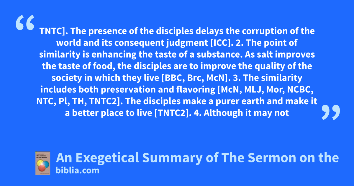 TNTC]. The presence of the disciples delays the corruption of the world and its consequent judgment [ICC]. 2. The point of similarity is enhancing the taste of a substance. As salt improves the taste of food, the disciples are to improve the quality of the society in which they live [BBC, Brc, McN]. 3. The similarity includes both preservation and flavoring [McN, MLJ, Mor, NCBC, NTC, Pl, TH, TNTC2]. The disciples make a purer earth and make it a better place to live [TNTC2]. 4. Although it may not