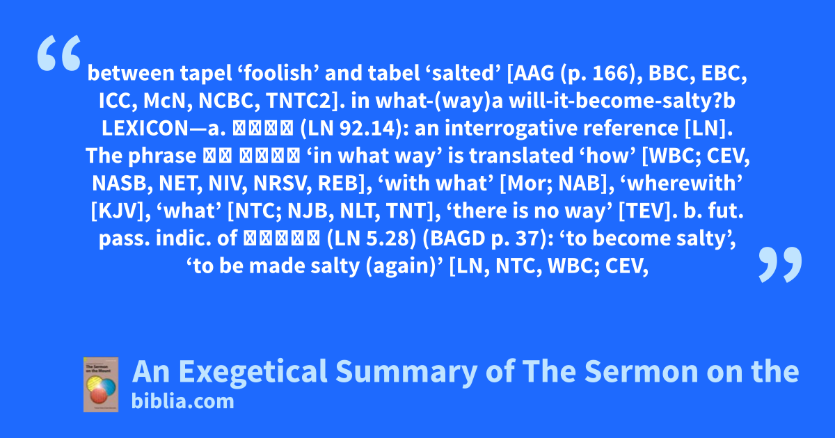 between tapel ‘foolish’ and tabel ‘salted’ [AAG (p. 166), BBC, EBC, ICC, McN, NCBC, TNTC2]. in what-(way)a will-it-become-salty?b LEXICON—a. τίνι (LN 92.14): an interrogative reference [LN]. The phrase ἐν τίνι ‘in what way’ is translated ‘how’ [WBC; CEV, NASB, NET, NIV, NRSV, REB], ‘with what’ [Mor; NAB], ‘wherewith’ [KJV], ‘what’ [NTC; NJB, NLT, TNT], ‘there is no way’ [TEV]. b. fut. pass. indic. of ἀλίζω (LN 5.28) (BAGD p. 37): ‘to become salty’, ‘to be made salty (again)’ [LN, NTC, WBC; CEV,