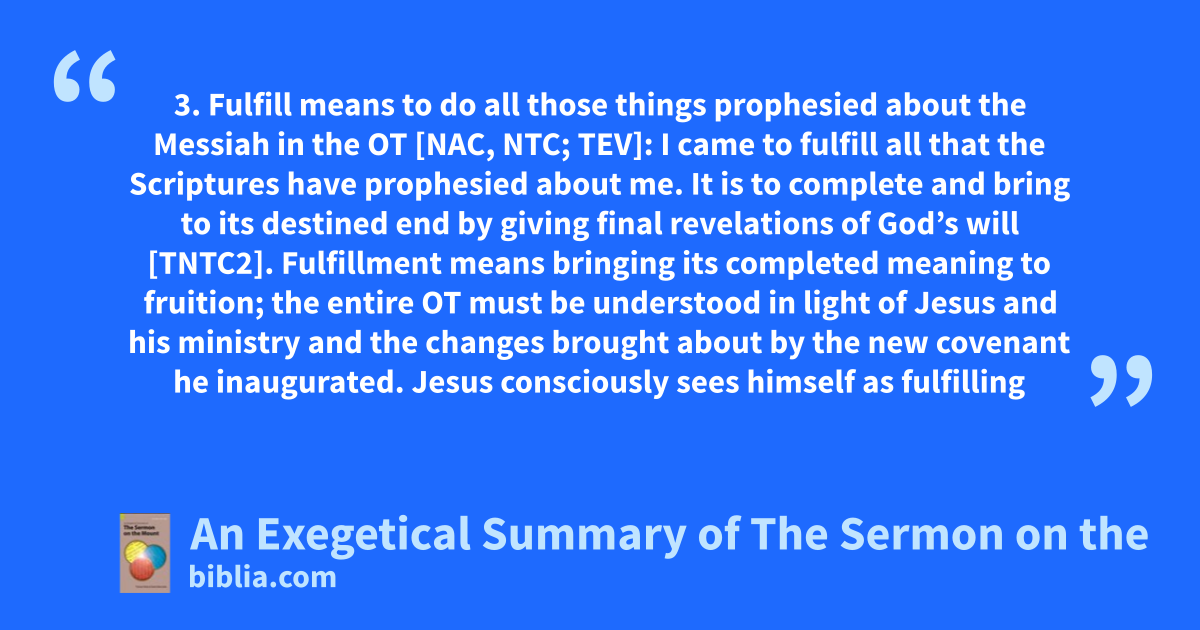 3. Fulfill means to do all those things prophesied about the Messiah in the OT [NAC, NTC; TEV]: I came to fulfill all that the Scriptures have prophesied about me. It is to complete and bring to its destined end by giving final revelations of God’s will [TNTC2]. Fulfillment means bringing its completed meaning to fruition; the entire OT must be understood in light of Jesus and his ministry and the changes brought about by the new covenant he inaugurated. Jesus consciously sees himself as fulfilling