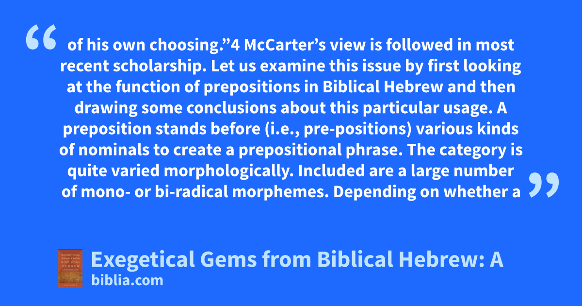 of his own choosing.”4 McCarter’s view is followed in most recent scholarship. Let us examine this issue by first looking at the function of prepositions in Biblical Hebrew and then drawing some conclusions about this particular usage. A preposition stands before (i.e., pre-positions) various kinds of nominals to create a prepositional phrase. The category is quite varied morphologically. Included are a large number of mono- or bi-radical morphemes. Depending on whether a
