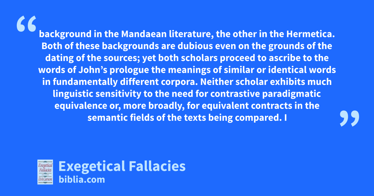 background in the Mandaean literature, the other in the Hermetica. Both of these backgrounds are dubious even on the grounds of the dating of the sources; yet both scholars proceed to ascribe to the words of John’s prologue the meanings of similar or identical words in fundamentally different corpora. Neither scholar exhibits much linguistic sensitivity to the need for contrastive paradigmatic equivalence or, more broadly, for equivalent contracts in the semantic fields of the texts being compared. I
