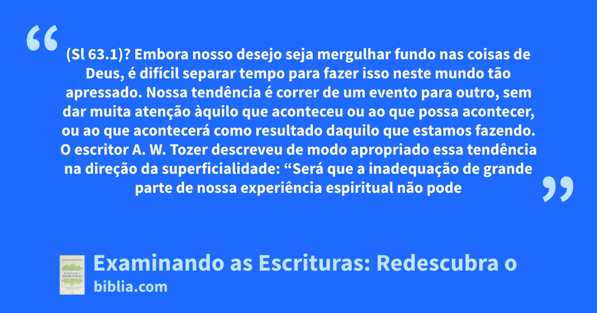 (Sl 63.1)? Embora nosso desejo seja mergulhar fundo nas coisas de Deus, é difícil separar tempo para fazer isso neste mundo tão apressado. Nossa tendência é correr de um evento para outro, sem dar muita atenção àquilo que aconteceu ou ao que possa acontecer, ou ao que acontecerá como resultado daquilo que estamos fazendo. O escritor A. W. Tozer descreveu de modo apropriado essa tendência na direção da superficialidade: “Será que a inadequação de grande parte de nossa experiência espiritual não pode