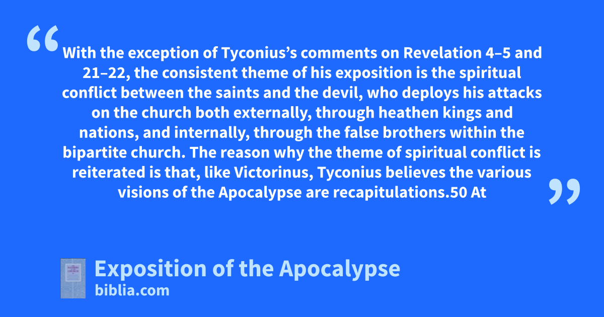 With the exception of Tyconius’s comments on Revelation 4–5 and 21–22, the consistent theme of his exposition is the spiritual conflict between the saints and the devil, who deploys his attacks on the church both externally, through heathen kings and nations, and internally, through the false brothers within the bipartite church. The reason why the theme of spiritual conflict is reiterated is that, like Victorinus, Tyconius believes the various visions of the Apocalypse are recapitulations.50 At