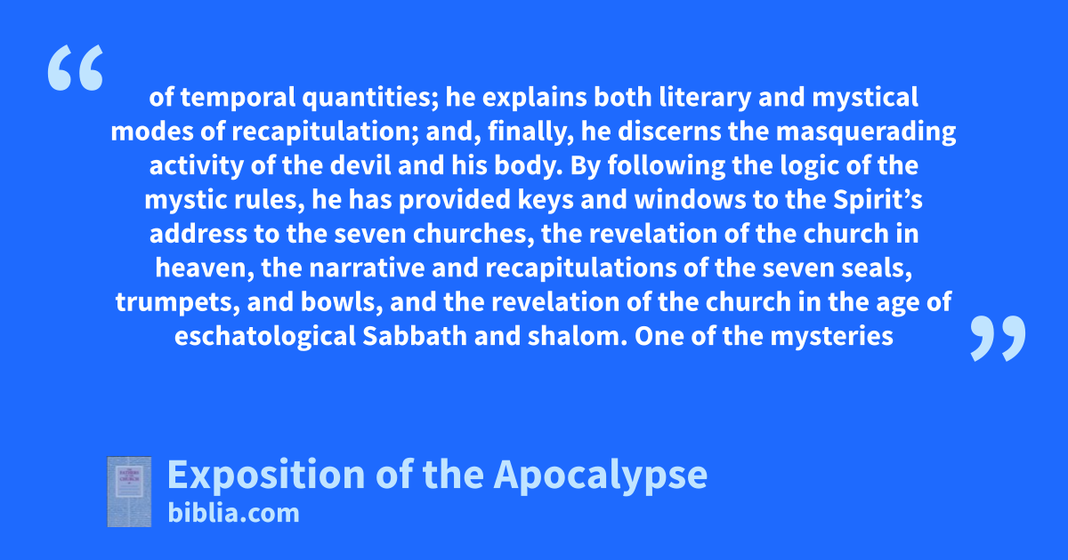 of temporal quantities; he explains both literary and mystical modes of recapitulation; and, finally, he discerns the masquerading activity of the devil and his body. By following the logic of the mystic rules, he has provided keys and windows to the Spirit’s address to the seven churches, the revelation of the church in heaven, the narrative and recapitulations of the seven seals, trumpets, and bowls, and the revelation of the church in the age of eschatological Sabbath and shalom. One of the mysteries