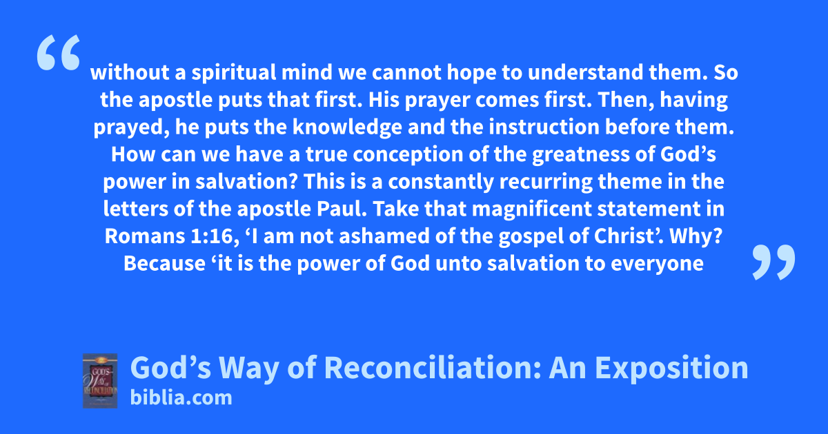 without a spiritual mind we cannot hope to understand them. So the apostle puts that first. His prayer comes first. Then, having prayed, he puts the knowledge and the instruction before them. How can we have a true conception of the greatness of God’s power in salvation? This is a constantly recurring theme in the letters of the apostle Paul. Take that magnificent statement in Romans 1:16, ‘I am not ashamed of the gospel of Christ’. Why? Because ‘it is the power of God unto salvation to everyone