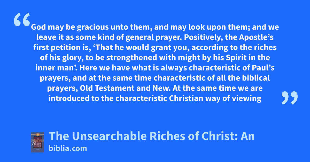 God may be gracious unto them, and may look upon them; and we leave it as some kind of general prayer. Positively, the Apostle’s first petition is, ‘That he would grant you, according to the riches of his glory, to be strengthened with might by his Spirit in the inner man’. Here we have what is always characteristic of Paul’s prayers, and at the same time characteristic of all the biblical prayers, Old Testament and New. At the same time we are introduced to the characteristic Christian way of viewing