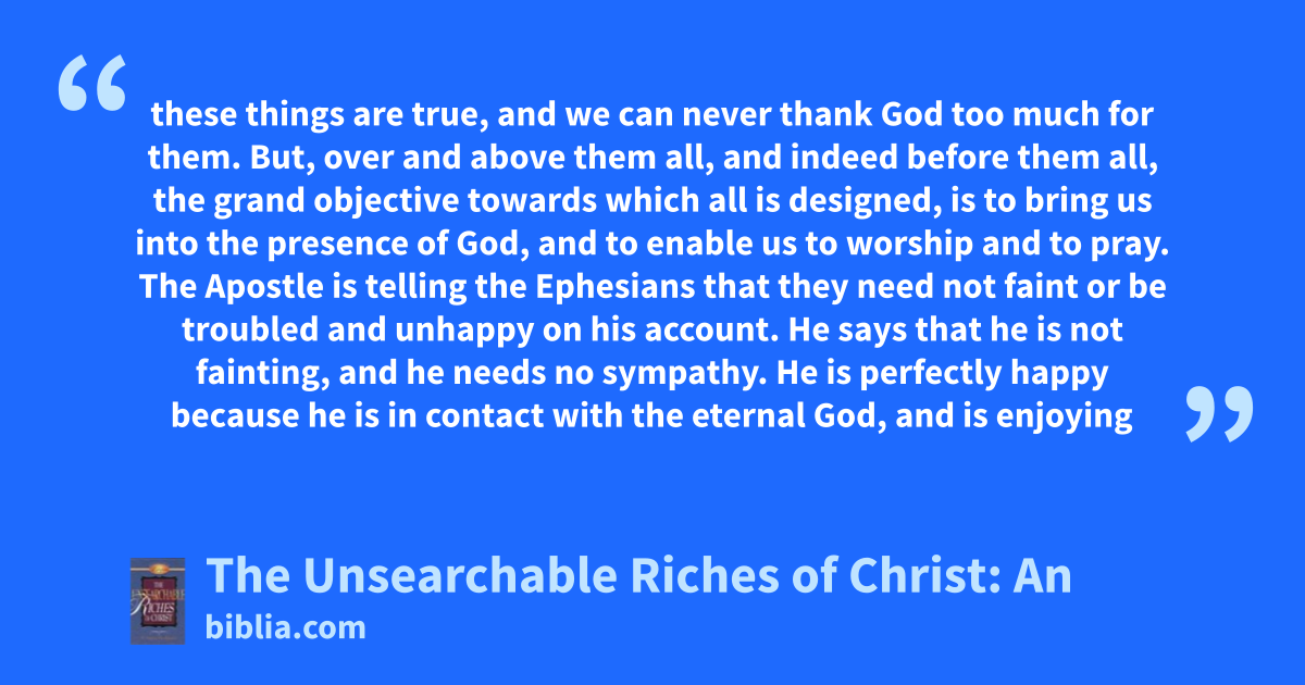these things are true, and we can never thank God too much for them. But, over and above them all, and indeed before them all, the grand objective towards which all is designed, is to bring us into the presence of God, and to enable us to worship and to pray. The Apostle is telling the Ephesians that they need not faint or be troubled and unhappy on his account. He says that he is not fainting, and he needs no sympathy. He is perfectly happy because he is in contact with the eternal God, and is enjoying
