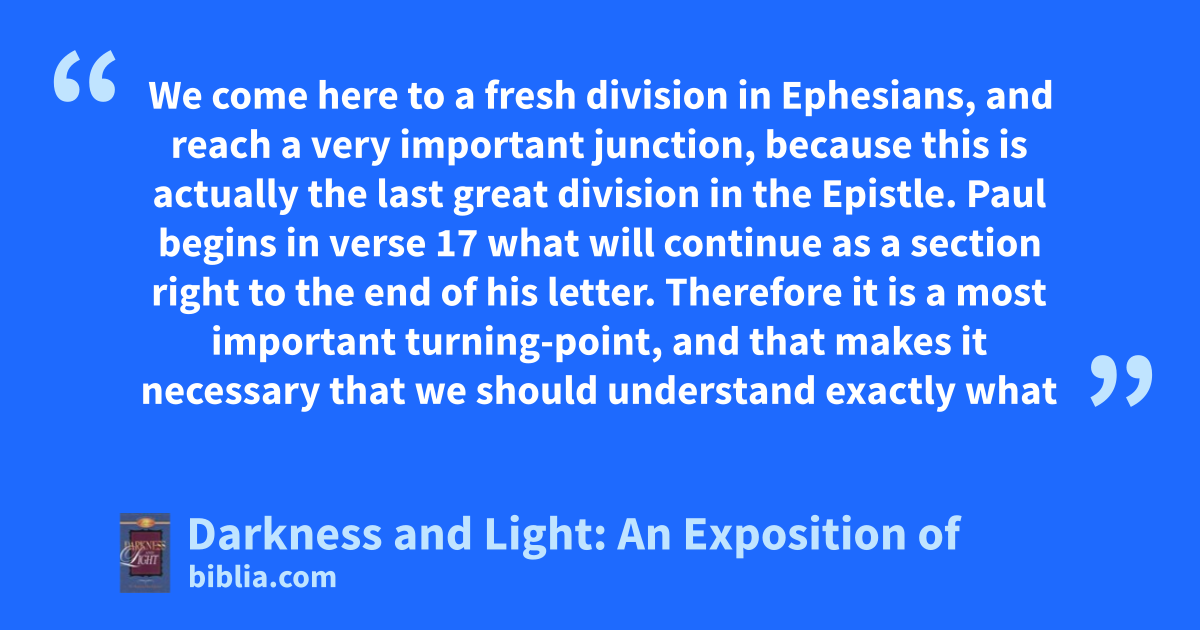 We come here to a fresh division in Ephesians, and reach a very important junction, because this is actually the last great division in the Epistle. Paul begins in verse 17 what will continue as a section right to the end of his letter. Therefore it is a most important turning-point, and that makes it necessary that we should understand exactly what