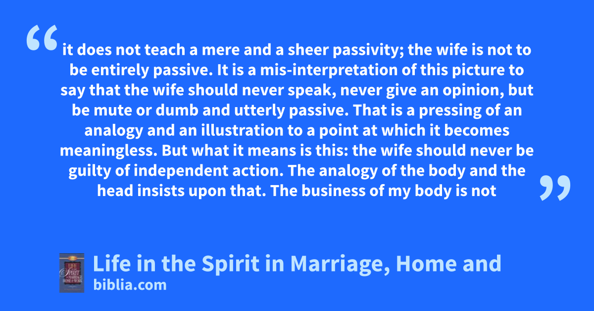 it does not teach a mere and a sheer passivity; the wife is not to be entirely passive. It is a mis-interpretation of this picture to say that the wife should never speak, never give an opinion, but be mute or dumb and utterly passive. That is a pressing of an analogy and an illustration to a point at which it becomes meaningless. But what it means is this: the wife should never be guilty of independent action. The analogy of the body and the head insists upon that. The business of my body is not