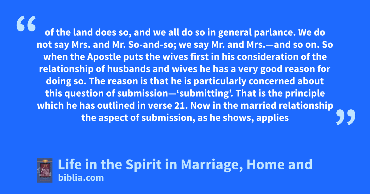 of the land does so, and we all do so in general parlance. We do not say Mrs. and Mr. So-and-so; we say Mr. and Mrs.—and so on. So when the Apostle puts the wives first in his consideration of the relationship of husbands and wives he has a very good reason for doing so. The reason is that he is particularly concerned about this question of submission—‘submitting’. That is the principle which he has outlined in verse 21. Now in the married relationship the aspect of submission, as he shows, applies