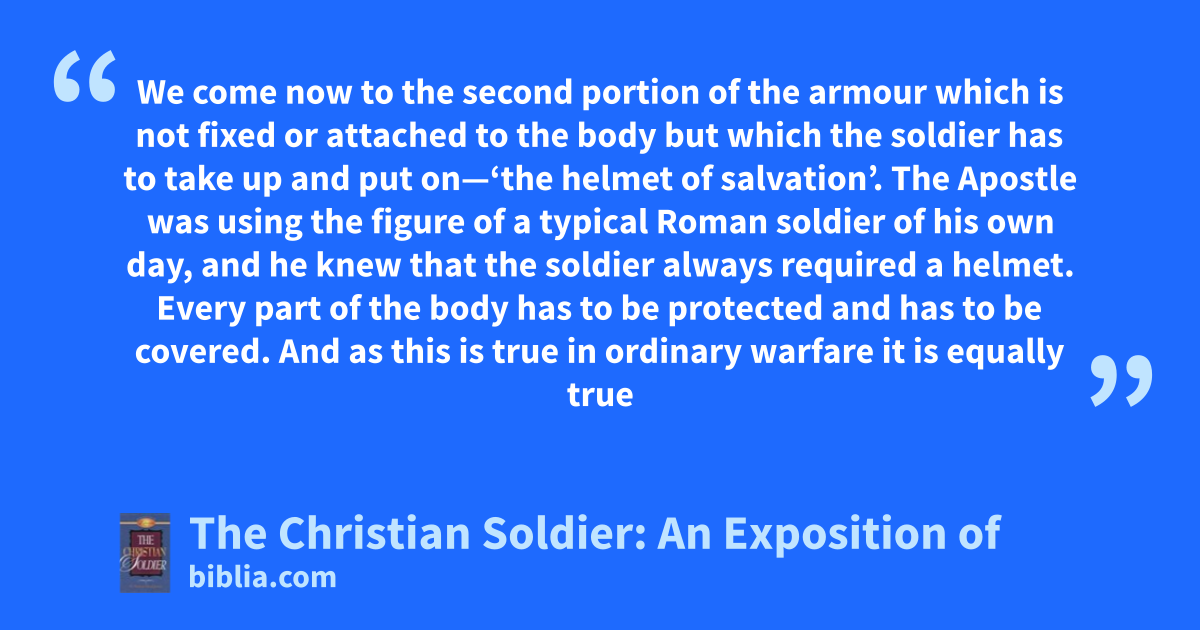 We come now to the second portion of the armour which is not fixed or attached to the body but which the soldier has to take up and put on—‘the helmet of salvation’. The Apostle was using the figure of a typical Roman soldier of his own day, and he knew that the soldier always required a helmet. Every part of the body has to be protected and has to be covered. And as this is true in ordinary warfare it is equally true