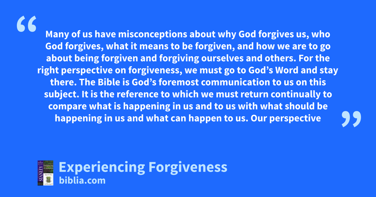 Many of us have misconceptions about why God forgives us, who God forgives, what it means to be forgiven, and how we are to go about being forgiven and forgiving ourselves and others. For the right perspective on forgiveness, we must go to God’s Word and stay there. The Bible is God’s foremost communication to us on this subject. It is the reference to which we must return continually to compare what is happening in us and to us with what should be happening in us and what can happen to us. Our perspective