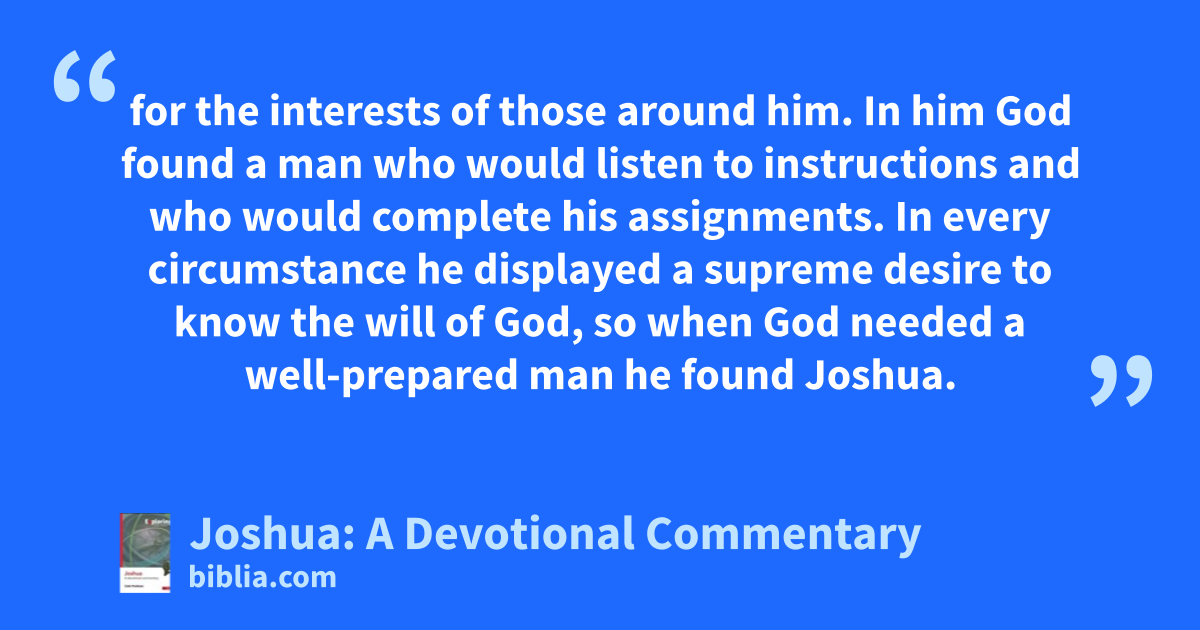 for the interests of those around him. In him God found a man who would listen to instructions and who would complete his assignments. In every circumstance he displayed a supreme desire to know the will of God, so when God needed a well-prepared man he found Joshua.