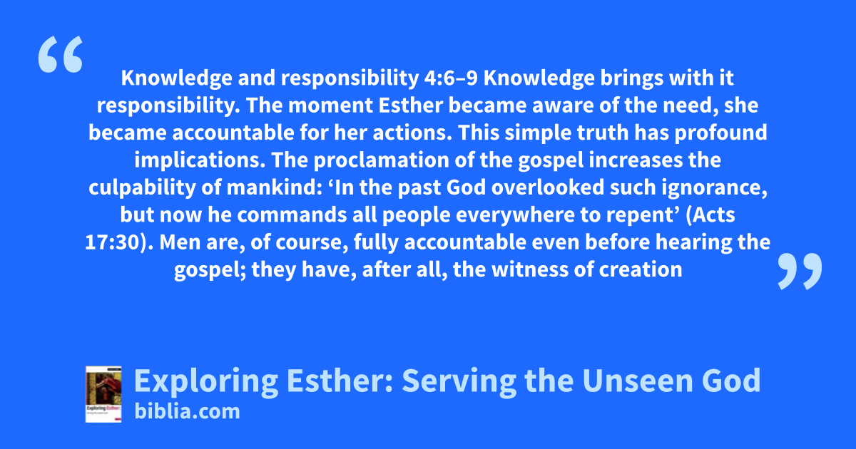 Knowledge and responsibility 4:6–9 Knowledge brings with it responsibility. The moment Esther became aware of the need, she became accountable for her actions. This simple truth has profound implications. The proclamation of the gospel increases the culpability of mankind: ‘In the past God overlooked such ignorance, but now he commands all people everywhere to repent’ (Acts 17:30). Men are, of course, fully accountable even before hearing the gospel; they have, after all, the witness of creation