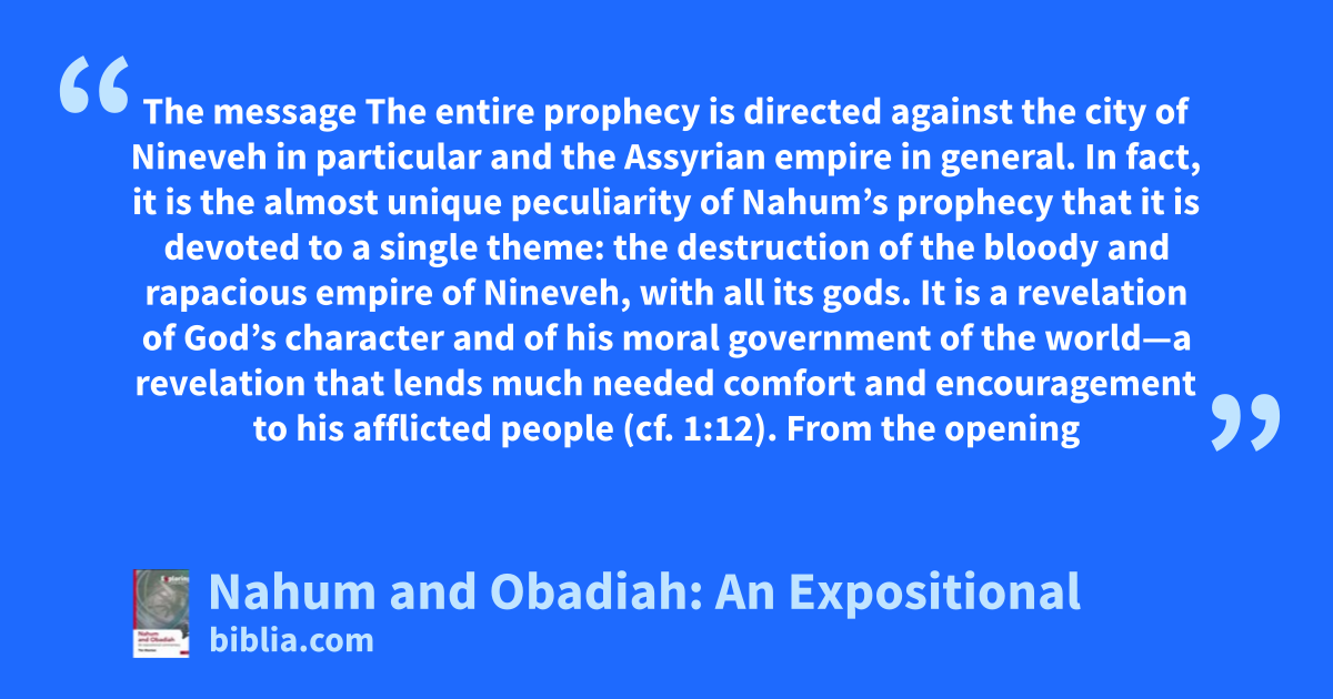 The message The entire prophecy is directed against the city of Nineveh in particular and the Assyrian empire in general. In fact, it is the almost unique peculiarity of Nahum’s prophecy that it is devoted to a single theme: the destruction of the bloody and rapacious empire of Nineveh, with all its gods. It is a revelation of God’s character and of his moral government of the world—a revelation that lends much needed comfort and encouragement to his afflicted people (cf. 1:12). From the opening