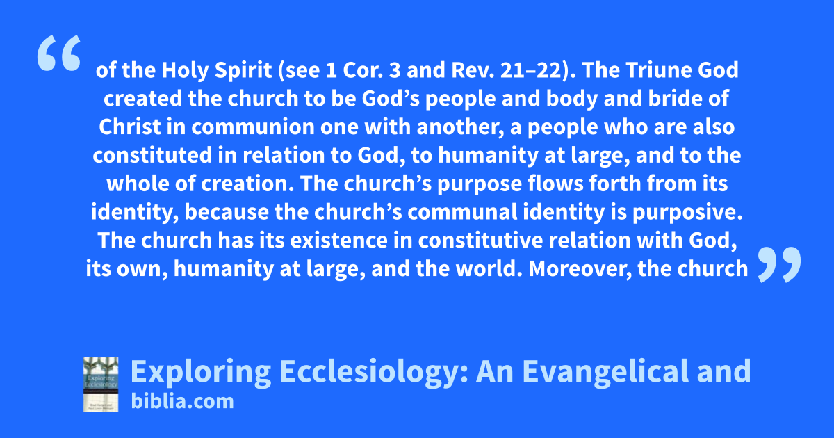 of the Holy Spirit (see 1 Cor. 3 and Rev. 21–22). The Triune God created the church to be God’s people and body and bride of Christ in communion one with another, a people who are also constituted in relation to God, to humanity at large, and to the whole of creation. The church’s purpose flows forth from its identity, because the church’s communal identity is purposive. The church has its existence in constitutive relation with God, its own, humanity at large, and the world. Moreover, the church