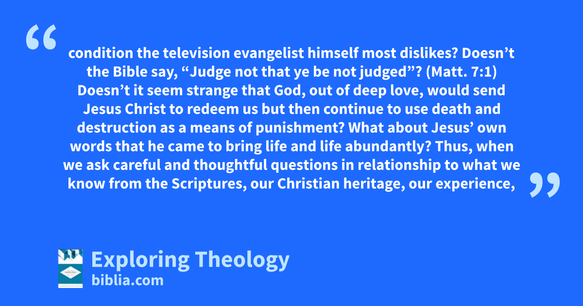 condition the television evangelist himself most dislikes? Doesn’t the Bible say, “Judge not that ye be not judged”? (Matt. 7:1) Doesn’t it seem strange that God, out of deep love, would send Jesus Christ to redeem us but then continue to use death and destruction as a means of punishment? What about Jesus’ own words that he came to bring life and life abundantly? Thus, when we ask careful and thoughtful questions in relationship to what we know from the Scriptures, our Christian heritage, our experience,
