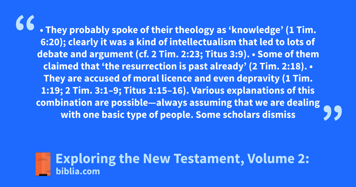 • They probably spoke of their theology as ‘knowledge’ (1 Tim. 6:20); clearly it was a kind of intellectualism that led to lots of debate and argument (cf. 2 Tim. 2:23; Titus 3:9). • Some of them claimed that ‘the resurrection is past already’ (2 Tim. 2:18). • They are accused of moral licence and even depravity (1 Tim. 1:19; 2 Tim. 3:1–9; Titus 1:15–16). Various explanations of this combination are possible—always assuming that we are dealing with one basic type of people. Some scholars dismiss