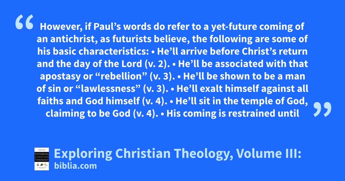 However, if Paul’s words do refer to a yet-future coming of an antichrist, as futurists believe, the following are some of his basic characteristics: • He’ll arrive before Christ’s return and the day of the Lord (v. 2). • He’ll be associated with that apostasy or “rebellion” (v. 3). • He’ll be shown to be a man of sin or “lawlessness” (v. 3). • He’ll exalt himself against all faiths and God himself (v. 4). • He’ll sit in the temple of God, claiming to be God (v. 4). • His coming is restrained until