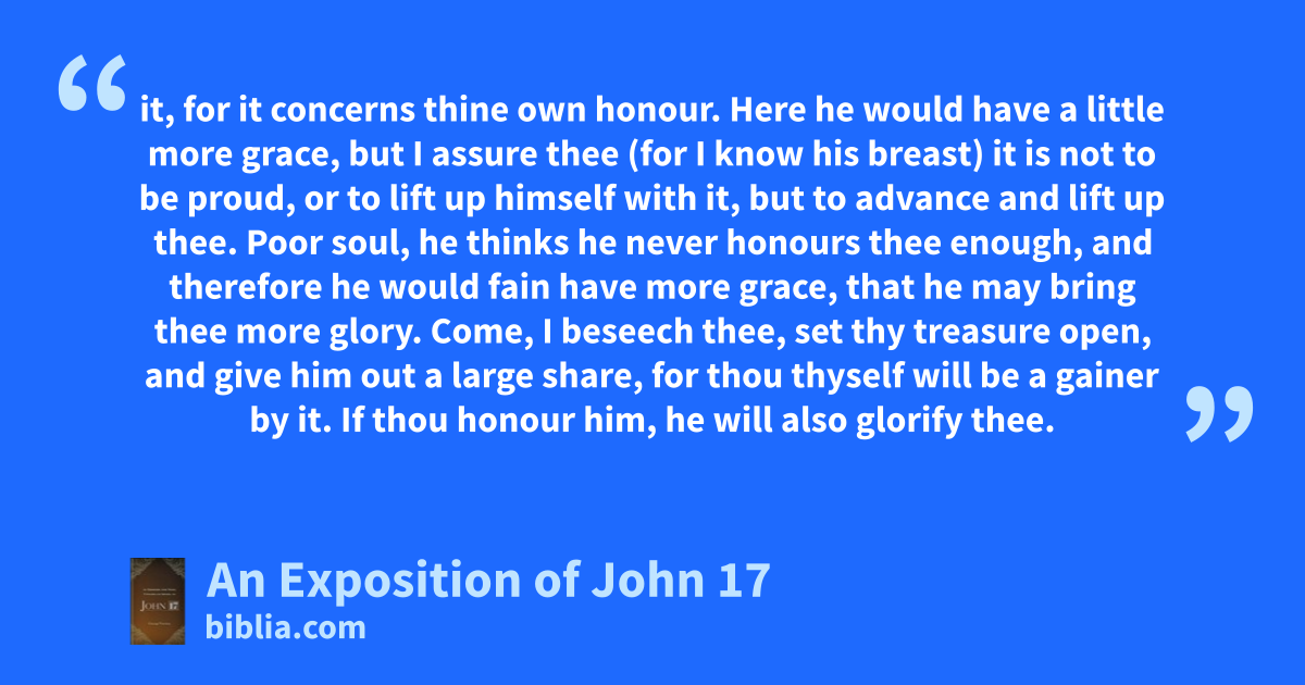it, for it concerns thine own honour. Here he would have a little more grace, but I assure thee (for I know his breast) it is not to be proud, or to lift up himself with it, but to advance and lift up thee. Poor soul, he thinks he never honours thee enough, and therefore he would fain have more grace, that he may bring thee more glory. Come, I beseech thee, set thy treasure open, and give him out a large share, for thou thyself will be a gainer by it. If thou honour him, he will also glorify thee.