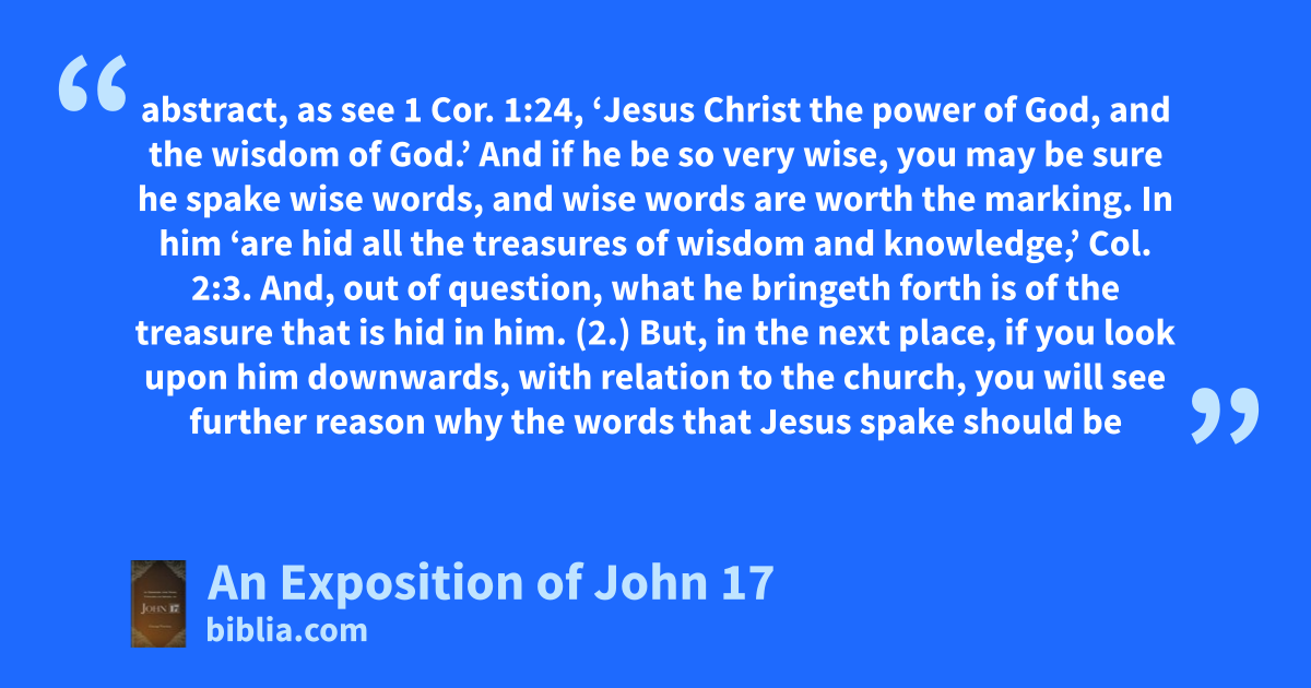 abstract, as see 1 Cor. 1:24, ‘Jesus Christ the power of God, and the wisdom of God.’ And if he be so very wise, you may be sure he spake wise words, and wise words are worth the marking. In him ‘are hid all the treasures of wisdom and knowledge,’ Col. 2:3. And, out of question, what he bringeth forth is of the treasure that is hid in him. (2.) But, in the next place, if you look upon him downwards, with relation to the church, you will see further reason why the words that Jesus spake should be