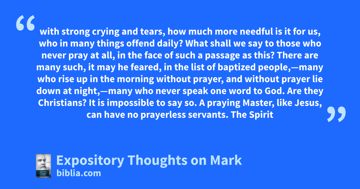with strong crying and tears, how much more needful is it for us, who in many things offend daily? What shall we say to those who never pray at all, in the face of such a passage as this? There are many such, it may he feared, in the list of baptized people,—many who rise up in the morning without prayer, and without prayer lie down at night,—many who never speak one word to God. Are they Christians? It is impossible to say so. A praying Master, like Jesus, can have no prayerless servants. The Spirit