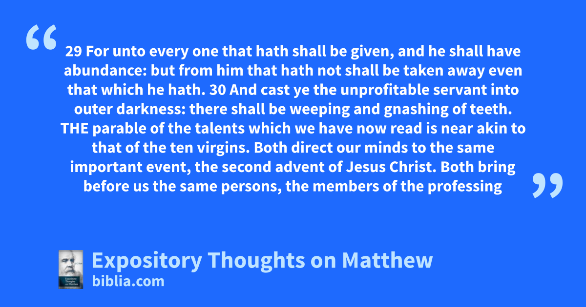 29 For unto every one that hath shall be given, and he shall have abundance: but from him that hath not shall be taken away even that which he hath. 30 And cast ye the unprofitable servant into outer darkness: there shall be weeping and gnashing of teeth. THE parable of the talents which we have now read is near akin to that of the ten virgins. Both direct our minds to the same important event, the second advent of Jesus Christ. Both bring before us the same persons, the members of the professing