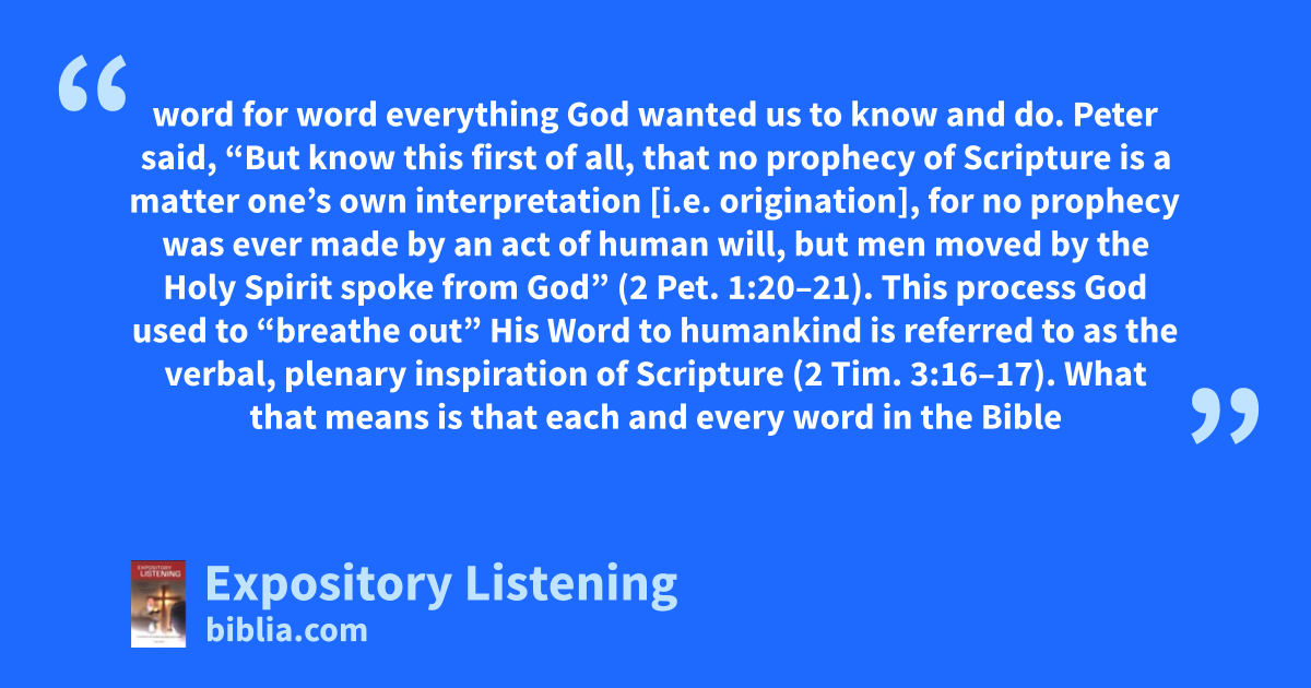 word for word everything God wanted us to know and do. Peter said, “But know this first of all, that no prophecy of Scripture is a matter one’s own interpretation [i.e. origination], for no prophecy was ever made by an act of human will, but men moved by the Holy Spirit spoke from God” (2 Pet. 1:20–21). This process God used to “breathe out” His Word to humankind is referred to as the verbal, plenary inspiration of Scripture (2 Tim. 3:16–17). What that means is that each and every word in the Bible