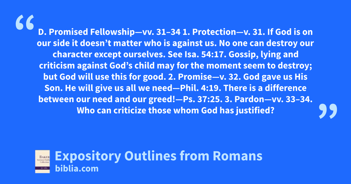 D. Promised Fellowship—vv. 31–34 1. Protection—v. 31. If God is on our side it doesn’t matter who is against us. No one can destroy our character except ourselves. See Isa. 54:17. Gossip, lying and criticism against God’s child may for the moment seem to destroy; but God will use this for good. 2. Promise—v. 32. God gave us His Son. He will give us all we need—Phil. 4:19. There is a difference between our need and our greed!—Ps. 37:25. 3. Pardon—vv. 33–34. Who can criticize those whom God has justified?