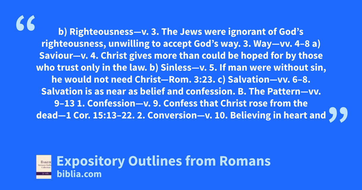 b) Righteousness—v. 3. The Jews were ignorant of God’s righteousness, unwilling to accept God’s way. 3. Way—vv. 4–8 a) Saviour—v. 4. Christ gives more than could be hoped for by those who trust only in the law. b) Sinless—v. 5. If man were without sin, he would not need Christ—Rom. 3:23. c) Salvation—vv. 6–8. Salvation is as near as belief and confession. B. The Pattern—vv. 9–13 1. Confession—v. 9. Confess that Christ rose from the dead—1 Cor. 15:13–22. 2. Conversion—v. 10. Believing in heart and