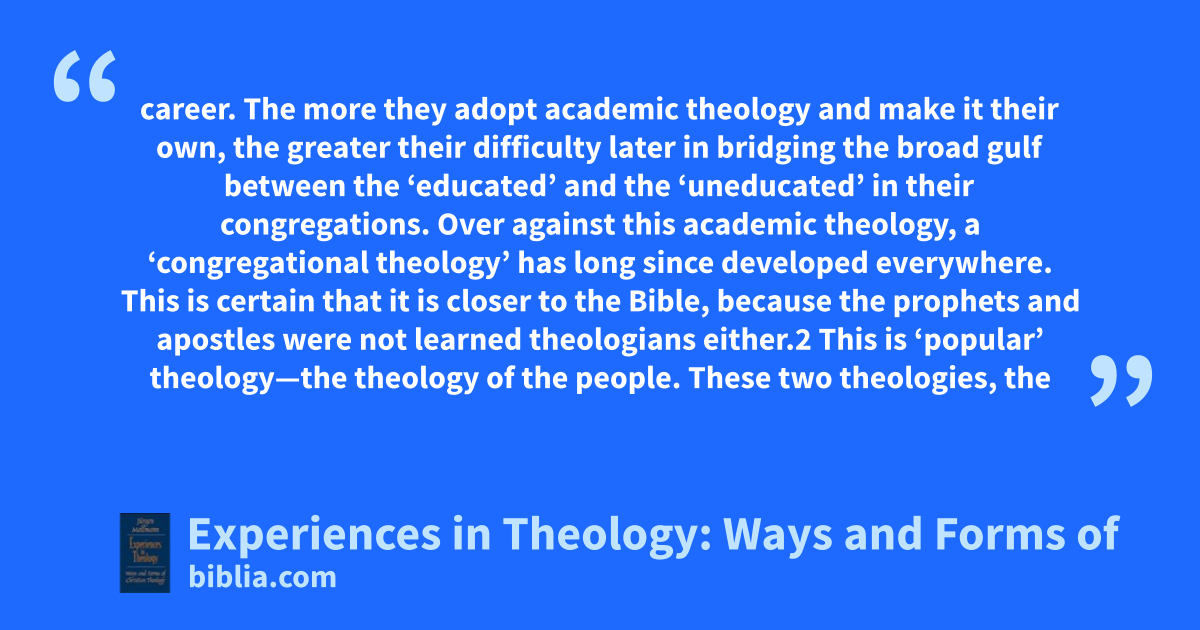 career. The more they adopt academic theology and make it their own, the greater their difficulty later in bridging the broad gulf between the ‘educated’ and the ‘uneducated’ in their congregations. Over against this academic theology, a ‘congregational theology’ has long since developed everywhere. This is certain that it is closer to the Bible, because the prophets and apostles were not learned theologians either.2 This is ‘popular’ theology—the theology of the people. These two theologies, the