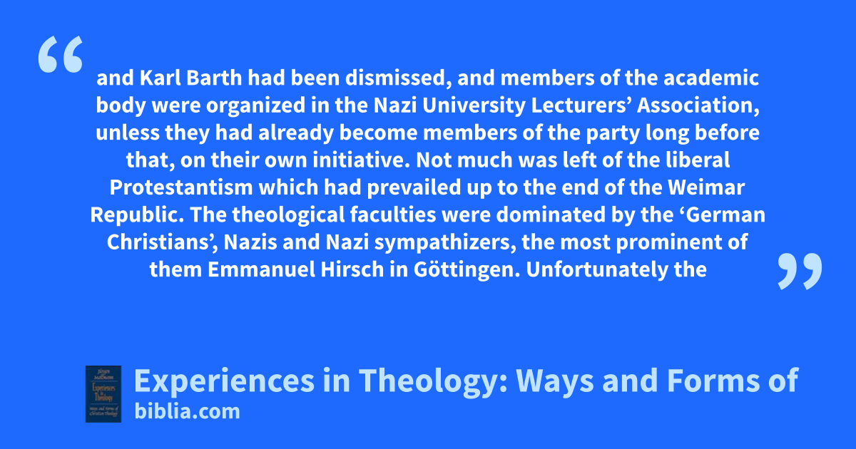 and Karl Barth had been dismissed, and members of the academic body were organized in the Nazi University Lecturers’ Association, unless they had already become members of the party long before that, on their own initiative. Not much was left of the liberal Protestantism which had prevailed up to the end of the Weimar Republic. The theological faculties were dominated by the ‘German Christians’, Nazis and Nazi sympathizers, the most prominent of them Emmanuel Hirsch in Göttingen. Unfortunately the