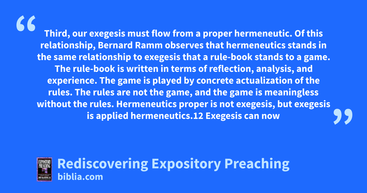 Third, our exegesis must flow from a proper hermeneutic. Of this relationship, Bernard Ramm observes that hermeneutics stands in the same relationship to exegesis that a rule-book stands to a game. The rule-book is written in terms of reflection, analysis, and experience. The game is played by concrete actualization of the rules. The rules are not the game, and the game is meaningless without the rules. Hermeneutics proper is not exegesis, but exegesis is applied hermeneutics.12 Exegesis can now
