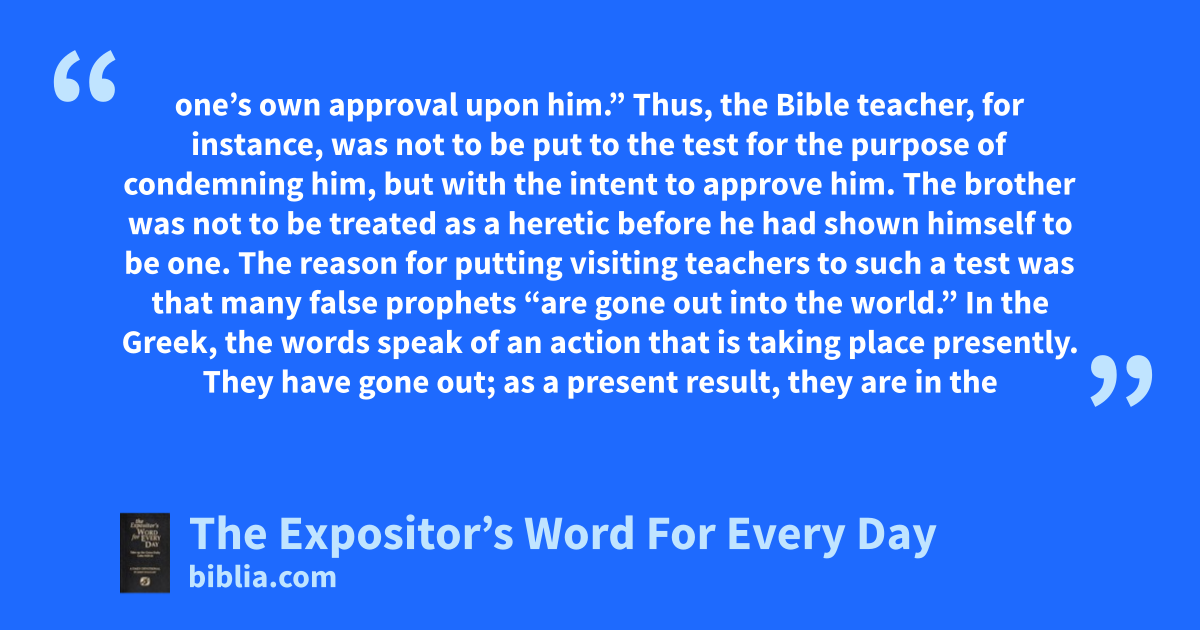 one’s own approval upon him.” Thus, the Bible teacher, for instance, was not to be put to the test for the purpose of condemning him, but with the intent to approve him. The brother was not to be treated as a heretic before he had shown himself to be one. The reason for putting visiting teachers to such a test was that many false prophets “are gone out into the world.” In the Greek, the words speak of an action that is taking place presently. They have gone out; as a present result, they are in the