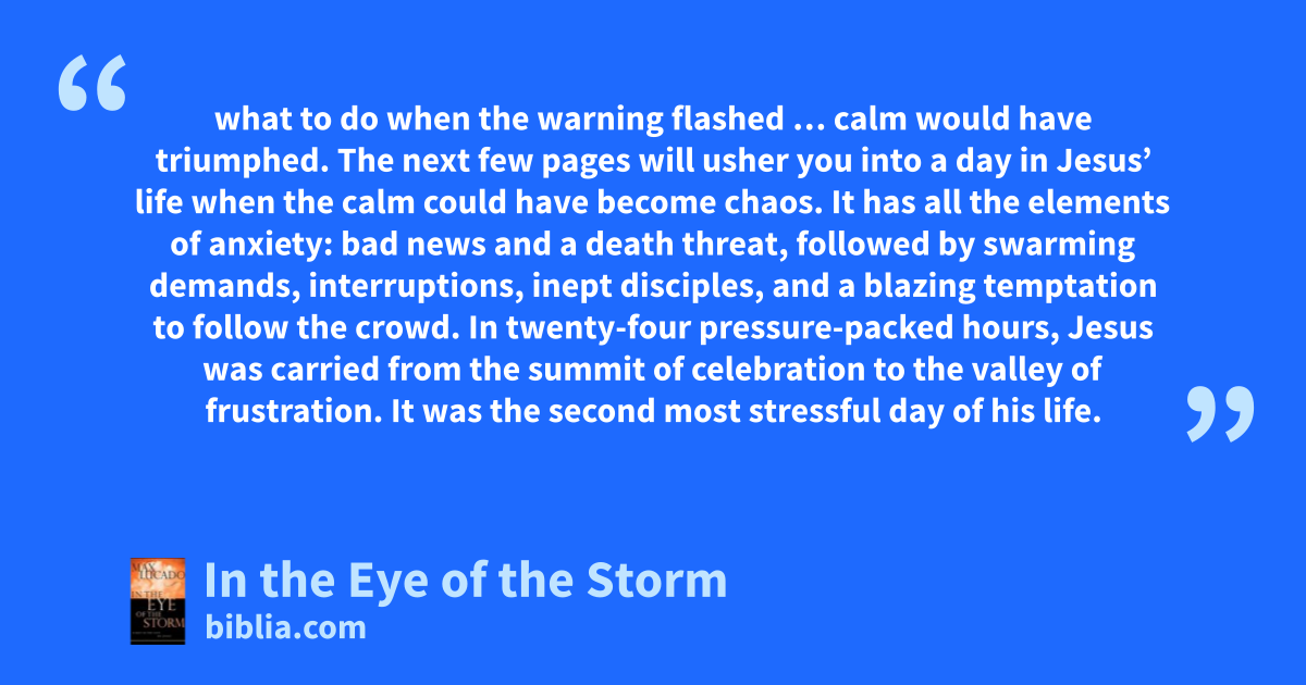 what to do when the warning flashed … calm would have triumphed. The next few pages will usher you into a day in Jesus’ life when the calm could have become chaos. It has all the elements of anxiety: bad news and a death threat, followed by swarming demands, interruptions, inept disciples, and a blazing temptation to follow the crowd. In twenty-four pressure-packed hours, Jesus was carried from the summit of celebration to the valley of frustration. It was the second most stressful day of his life.