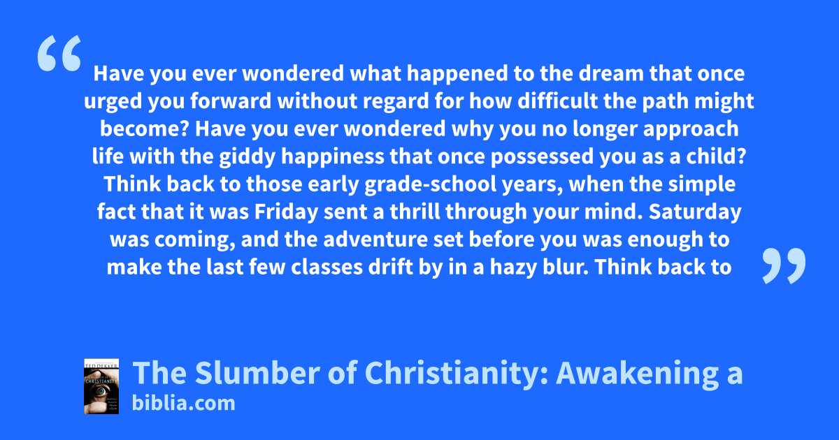 Have you ever wondered what happened to the dream that once urged you forward without regard for how difficult the path might become? Have you ever wondered why you no longer approach life with the giddy happiness that once possessed you as a child? Think back to those early grade-school years, when the simple fact that it was Friday sent a thrill through your mind. Saturday was coming, and the adventure set before you was enough to make the last few classes drift by in a hazy blur. Think back to