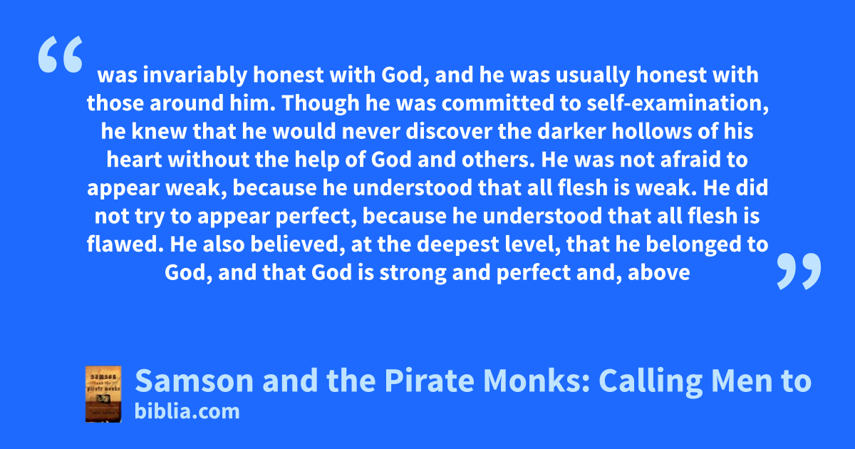 was invariably honest with God, and he was usually honest with those around him. Though he was committed to self-examination, he knew that he would never discover the darker hollows of his heart without the help of God and others. He was not afraid to appear weak, because he understood that all flesh is weak. He did not try to appear perfect, because he understood that all flesh is flawed. He also believed, at the deepest level, that he belonged to God, and that God is strong and perfect and, above